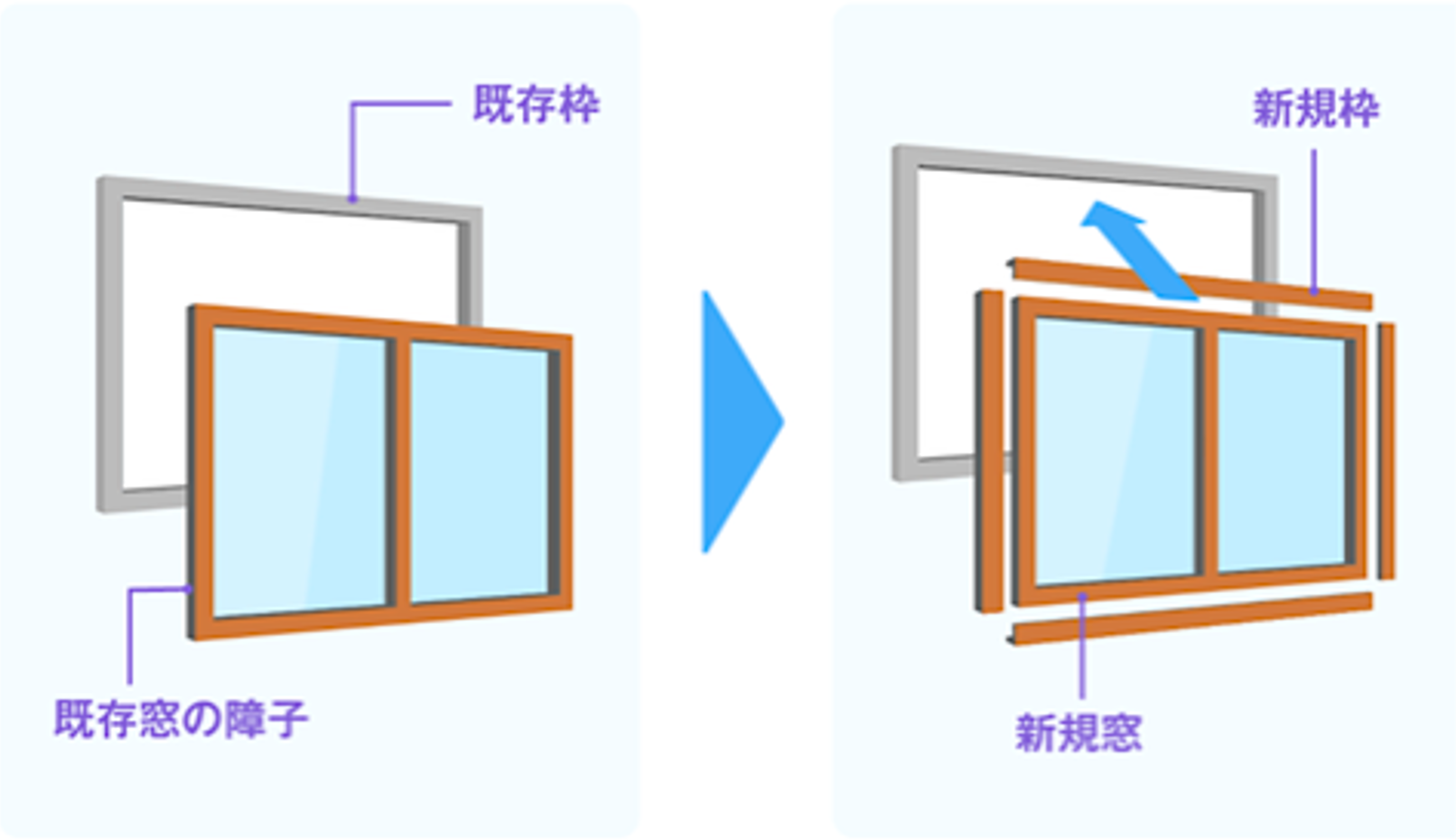 | はつり工法 | 既存ガラス及び窓枠を取り外し、新しい窓枠を取り付け、複層ガラス等に交換すること | |